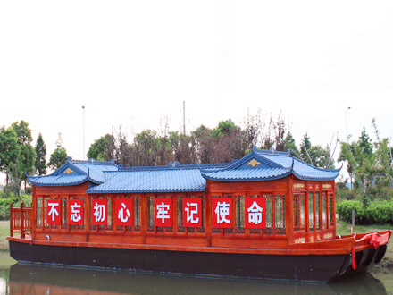 畫舫船就是裝飾古典華麗的游船,是"中國風"的仿古游船,結合古典園林建筑,體現了中華文明的古典藝術.畫舫船豪華而又古典,船上的建筑按照中國古代建筑里的亭臺樓閣,建筑工藝之復雜,要求之嚴格,仿古畫舫游船的特點飛檐翹角、玲瓏精致的四角亭子逐漸成形,赫然立于船頭,美人靠、盤龍柱子、彩畫……龍柱上的浮雕盤龍和祥云一層扣著一層,層層錯落有致,雕刻精細到盤龍身上的每一個鱗片都細細可數,古代皇家標志性元素,在畫舫船上體現的淋漓盡致。除了雕刻、花窗,整條船還有一個看點,那就是弧線優美、高高翹起的船尾。游船并不大,長約10米、寬3米,但是整體看起來堪稱一件藝術品。船尾的雕花欄桿與船艙、船頭的雕刻遙相呼應,船身四周貼著浮雕祥云,給整條船增添了富貴、華麗的氣質。